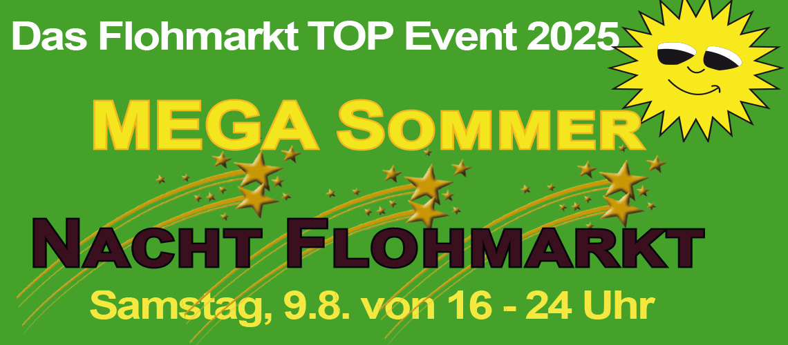 MIT LIVE MUSIK IM FOYER • SEKTSTAND • GASTRONOMIE für Besucher und preisgünstige Standmieten für Aussteller machen den MEGA Sommer NACHT Flohmarkt in diesem Jahr zu unserem Sommerhighlight.